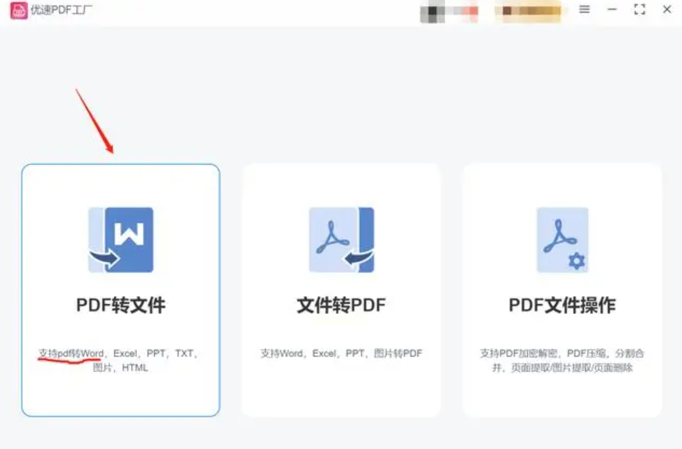 第一步:先在官网下载安装“优速PDF工厂”。打开软件后,在主界面找到“PDF转文件”功能,点击进入。