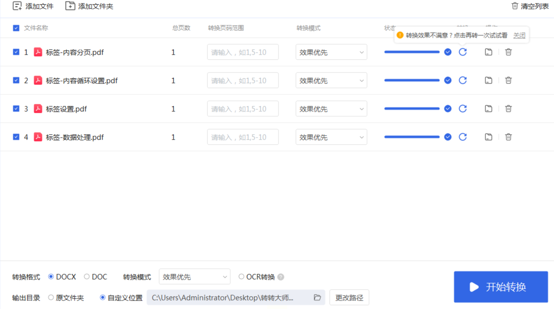 4. 点击“开始转换”后,稍等片刻就能完成。转换速度取决于文档大小和数量,一般几十页的文档也就一两分钟。