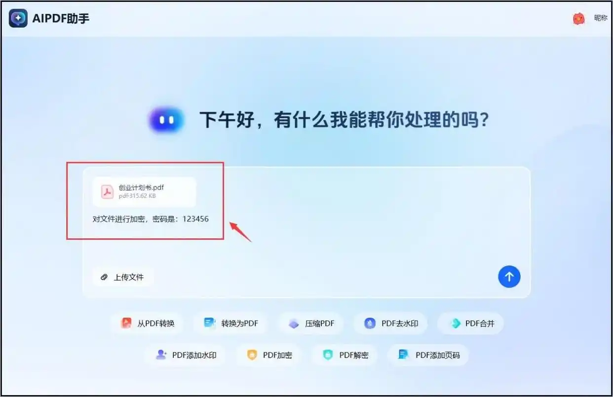 步骤二:在页面的对话框里,你可以直接输入文字指令,比如“帮我把这个PDF文件加密,密码设为123456”。或者,你也可以在页面上找到“PDF加密”这类功能按钮点进去。