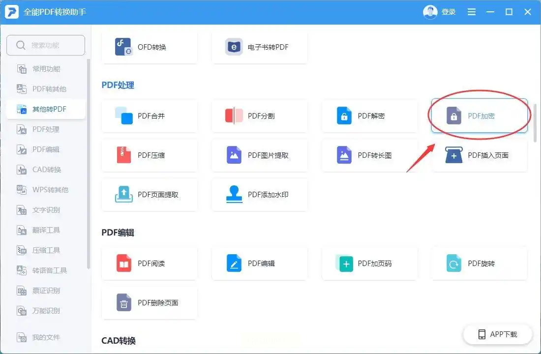 步骤一:启动软件,在它的主功能界面里,找到“PDF处理”或类似分类,然后在里面选择“PDF加密”功能。