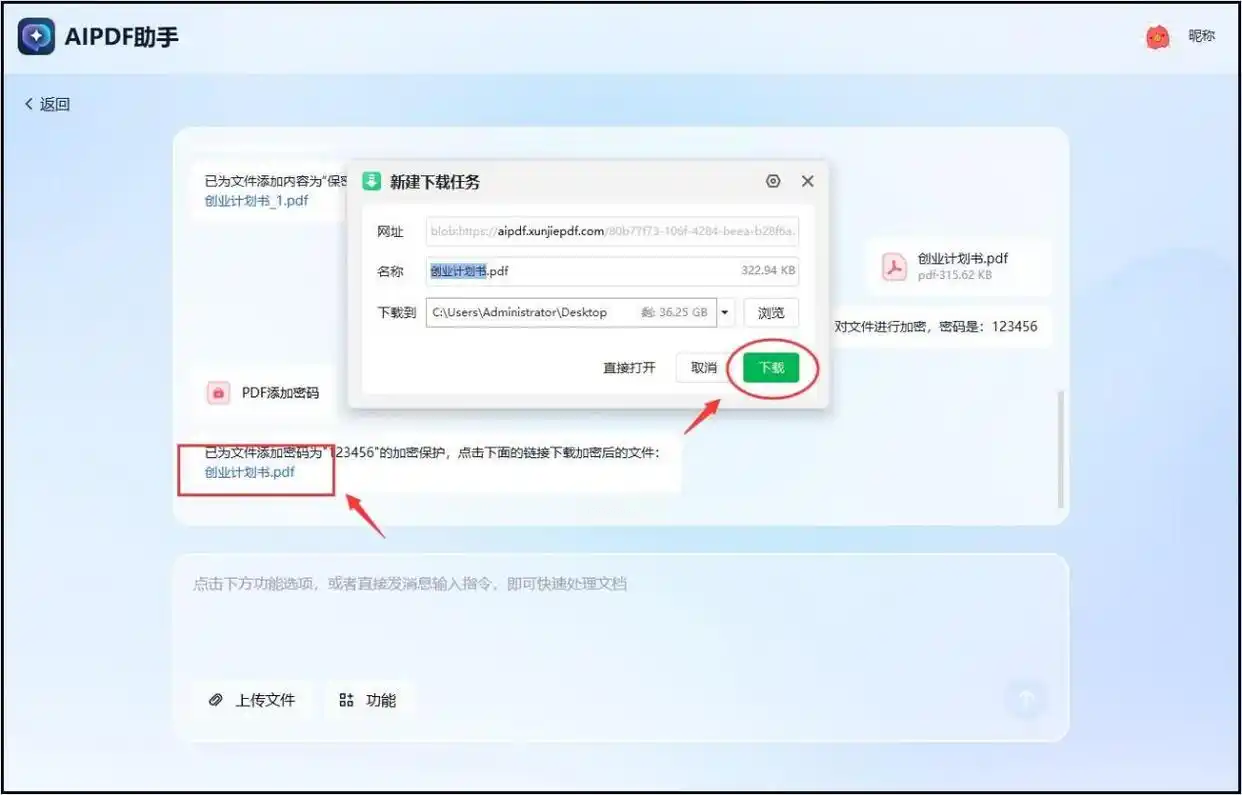 步骤五:点击那个下载链接,就能把已经加密好的PDF文件保存到你的电脑里了,整个过程像聊天一样简单。