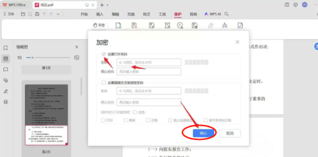 3. 设置密码:在弹出的密码设置窗口中,输入你想要的打开密码(建议包含字母、数字和特殊符号,提高安全性),再次输入确认密码,勾选是否需要修改权限密码(如限制打印、复制等)。