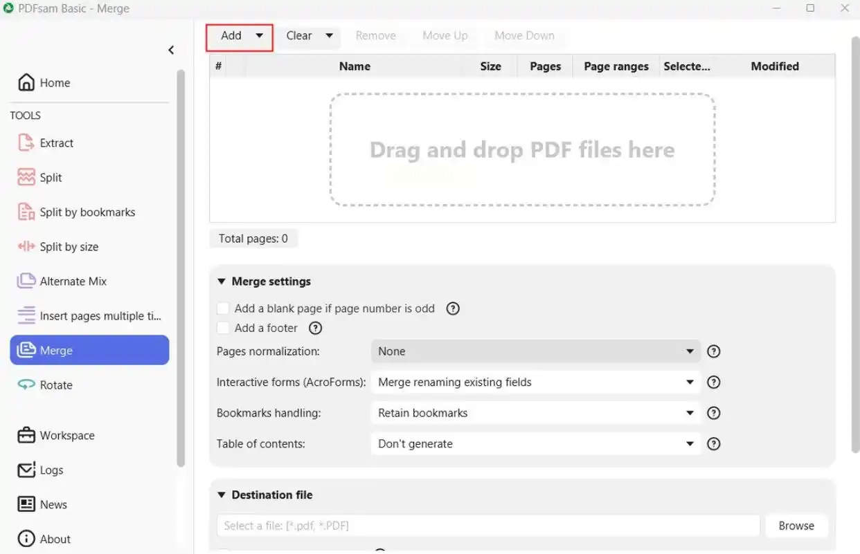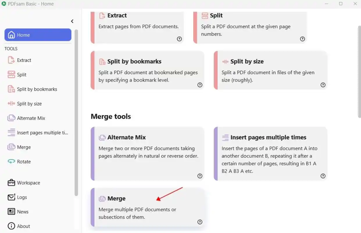 步骤一:启动PDFsam Basic,在「Home」界面选择「Merge」(合并)工具,界面分为左右两栏文件区。