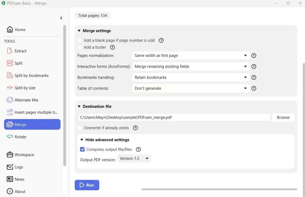 - 「Output filename pattern」:输入「Document_@n.pdf」生成带序号的合并文件
