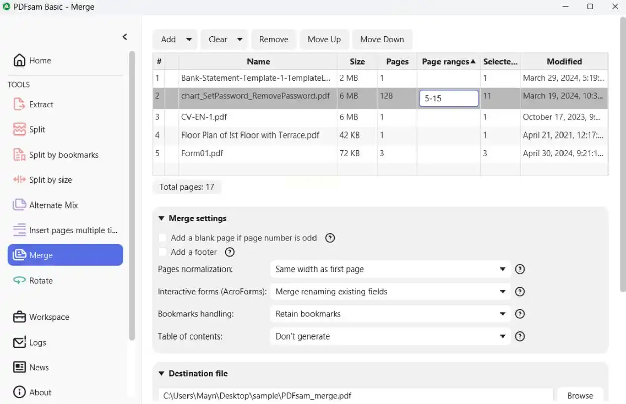 步骤三:点击「Page ranges」列单元格,输入「1-5,7-10」等范围值,仅合并指定页面。