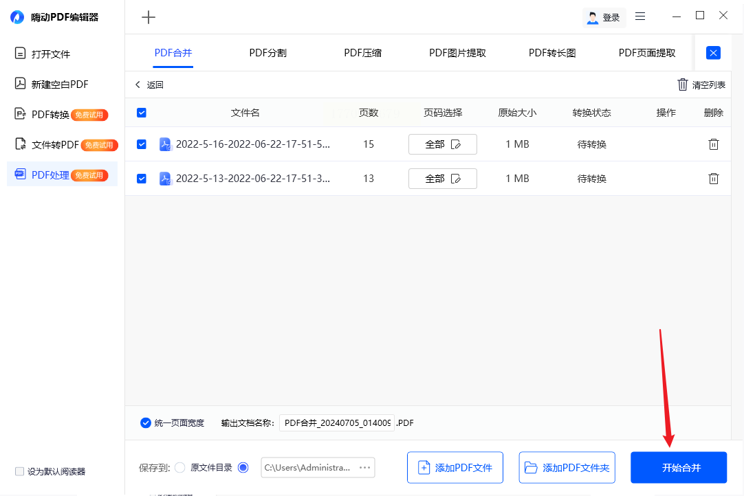 - 选择「统一页面宽度」确保输出文件格式一致