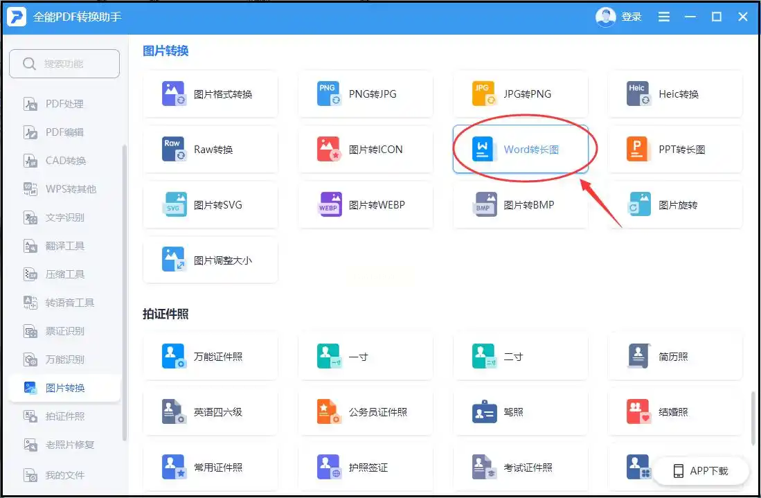 步骤一:在电脑上打开该软件,在功能导航栏中找到“图片转换”或类似分类,然后选择“Word转长图”功能。