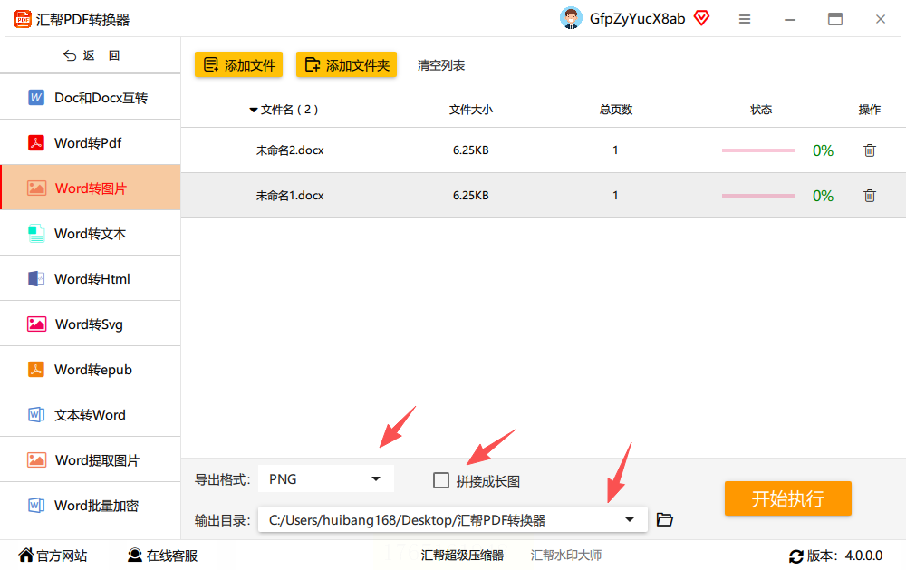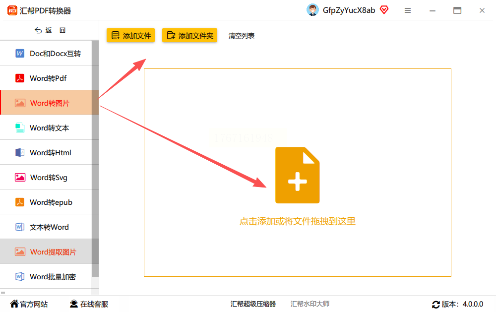 步骤二:进入功能页后,在左侧列表中选择“Word转图片”操作。在右侧区域,点击“添加文件”按钮上传你的Word文档,软件支持一次性添加多个文件进行批量处理。