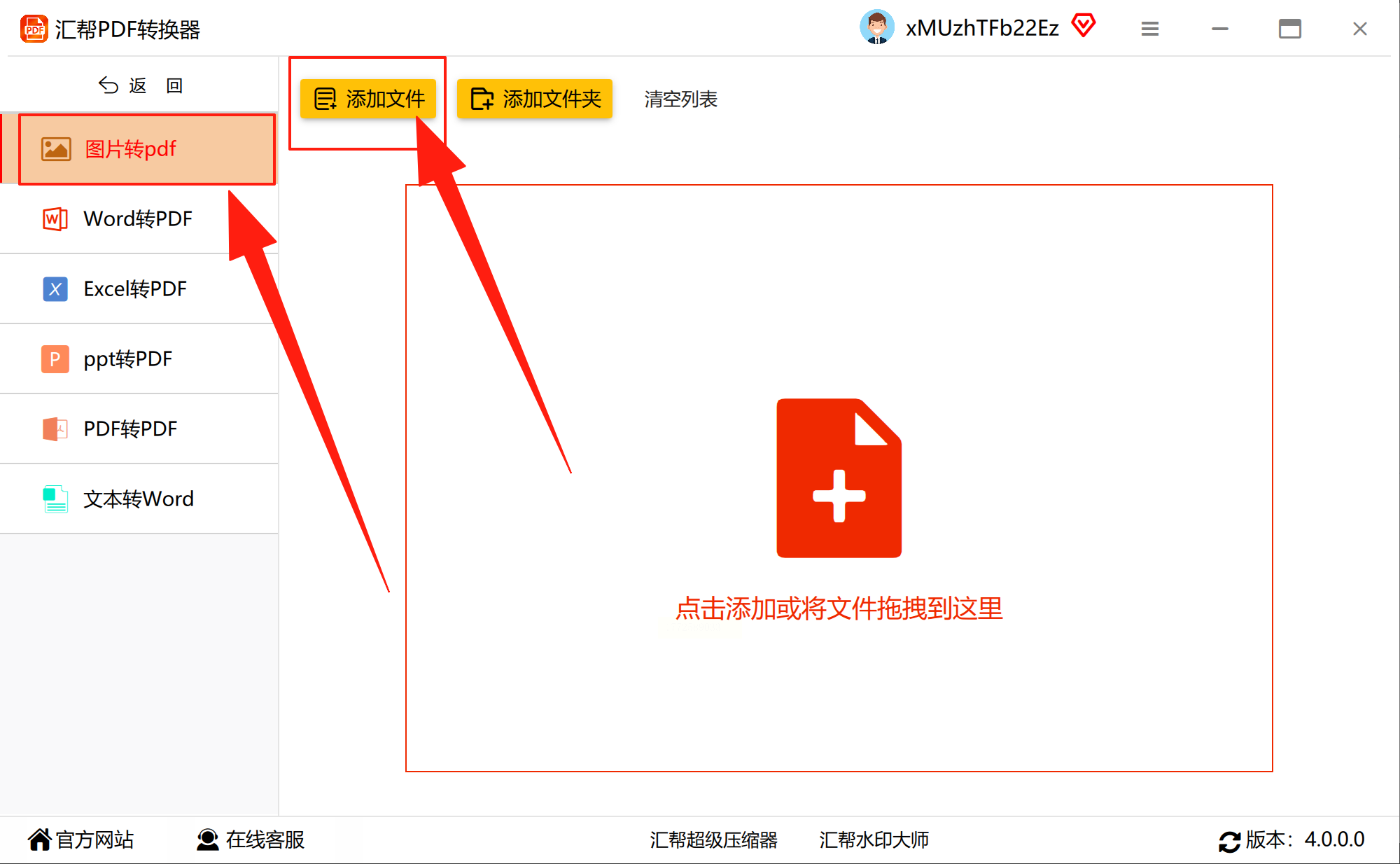 步骤二:添加图片文件。这里支持三种方式:直接点击"添加文件"按钮选择图片,或者把图片文件夹直接拖到软件界面里,还能通过"批量添加"一次性导入整个文件夹的图片。如果图片很多,这个批量导入功能就特别方便。
