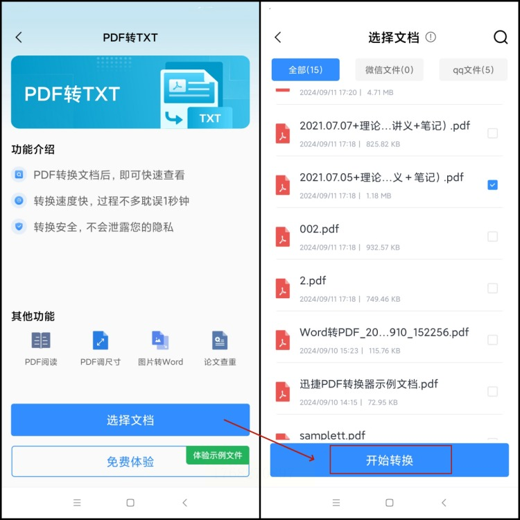 文件上传后,点击"开始转换",等软件处理完,转换后的TXT文件会出现在APP的"我的文件"里,直接点开就能查看内容,也可以分享给别人。
