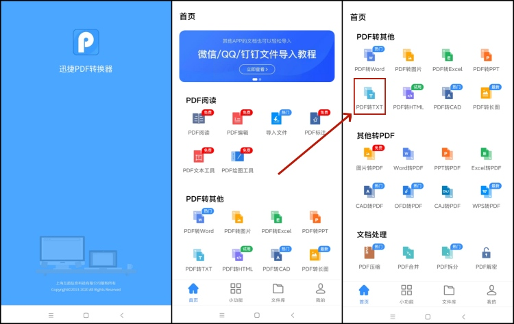 打开手机里的迅捷PDF转换器,主界面上有个"PDF转TXT"的选项,直接点进去。