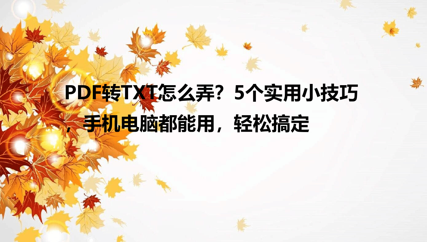 你是不是也遇到过这种情况:领导发的PDF文件要提取文字,却发现复制粘贴格式全乱了;老师给的电子教材是PDF格式,想在手机上看却不方便。别慌!PDF转TXT其实没那么难,今天我就把自己摸索出的5个超实用方法分享给你。不管你是电脑小白还是手机党,都能找到适合自己的操作方式。这篇教程会把每个步骤拆解开,连"怎么选文件夹""怎么批量导入"这种细节都告诉你,保证你看完就能上手,再也不用到处问人啦!
