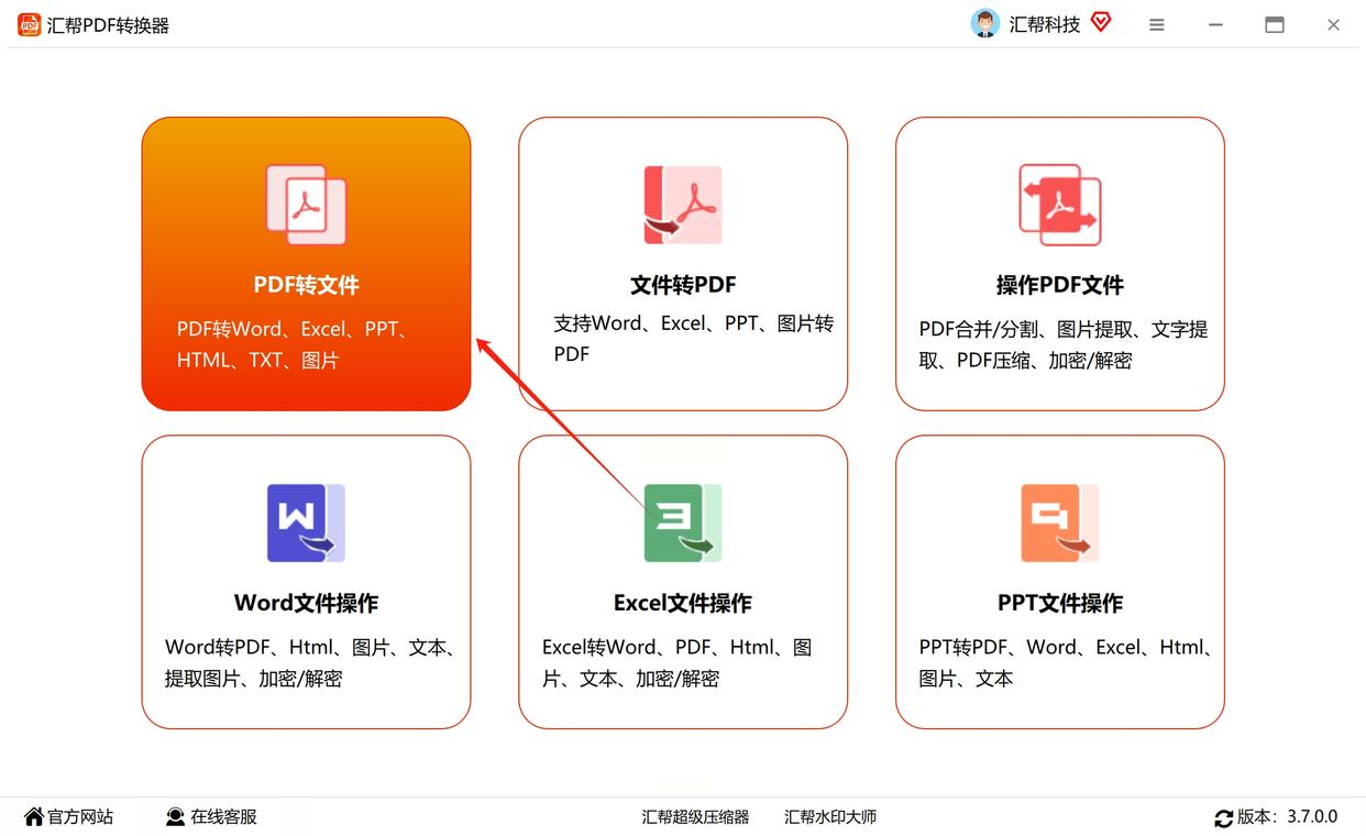 双击桌面上的汇帮PDF转换器图标,软件打开后你会看到一个很干净的主界面,最显眼的就是"PDF转文件"这几个字,直接点进去!