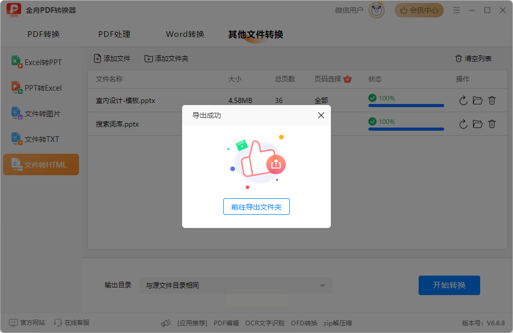 5. 查看结果:转换完会有提示,点“前往导出文件夹”就能看到转换好的HTML文件了,直接打开看看效果。