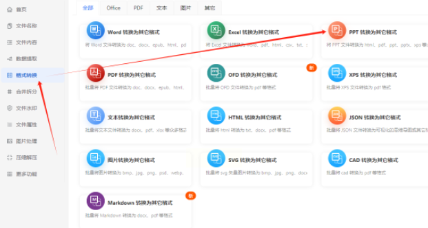 1. 打开工具箱:先找到“格式转换”,点进去后选“PPT转换为其它格式”。