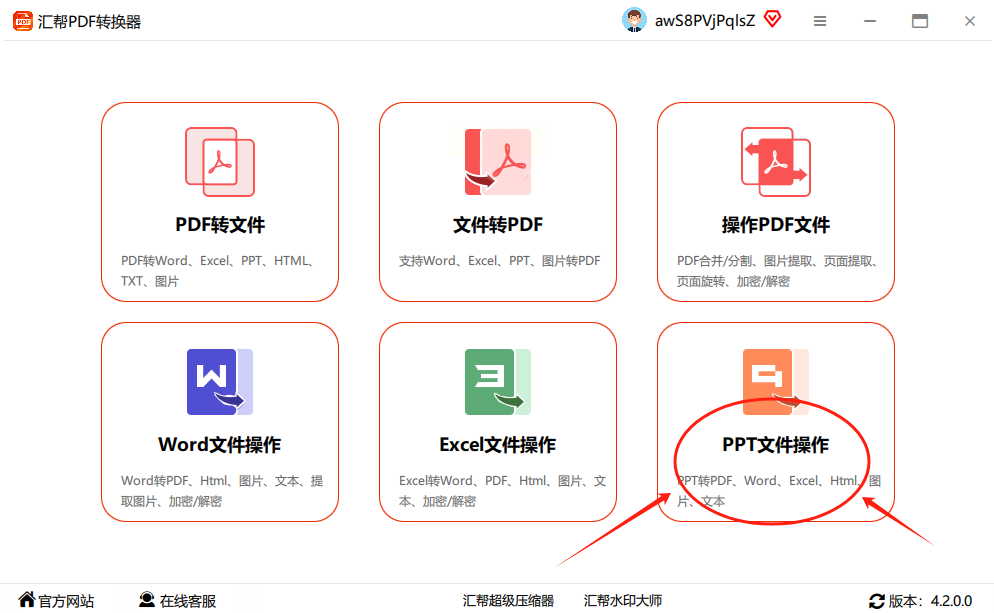先打开汇帮PDF转换器,界面上有六个分类,你看那个【ppt文件操作】,点进去!这里面有好多常用功能,比如PPT转Word、转Excel,还有我们今天要用到的PPT转HTML。