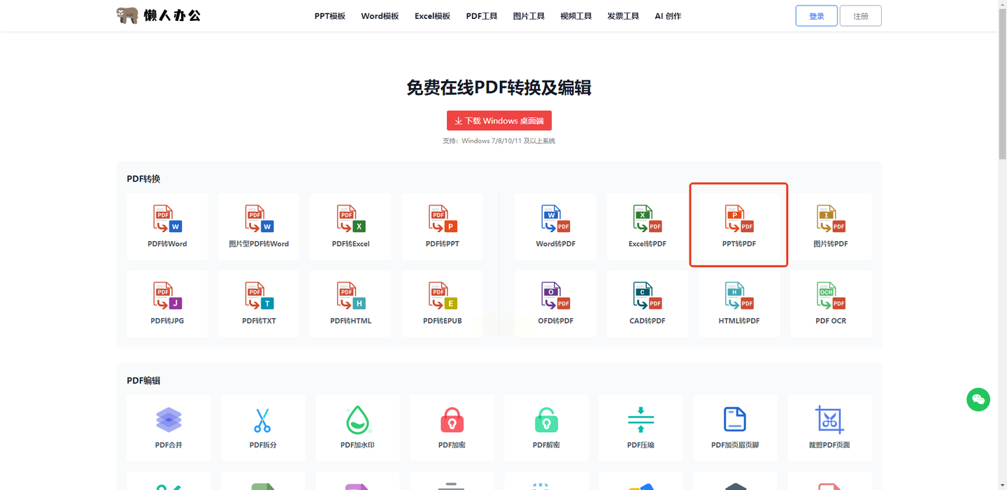 打开浏览器,输入“懒人办公”官网地址(确保进入正规平台),首页会显示各种办公工具入口,找到“PPT工具”分类下的“PPT转PDF”选项。