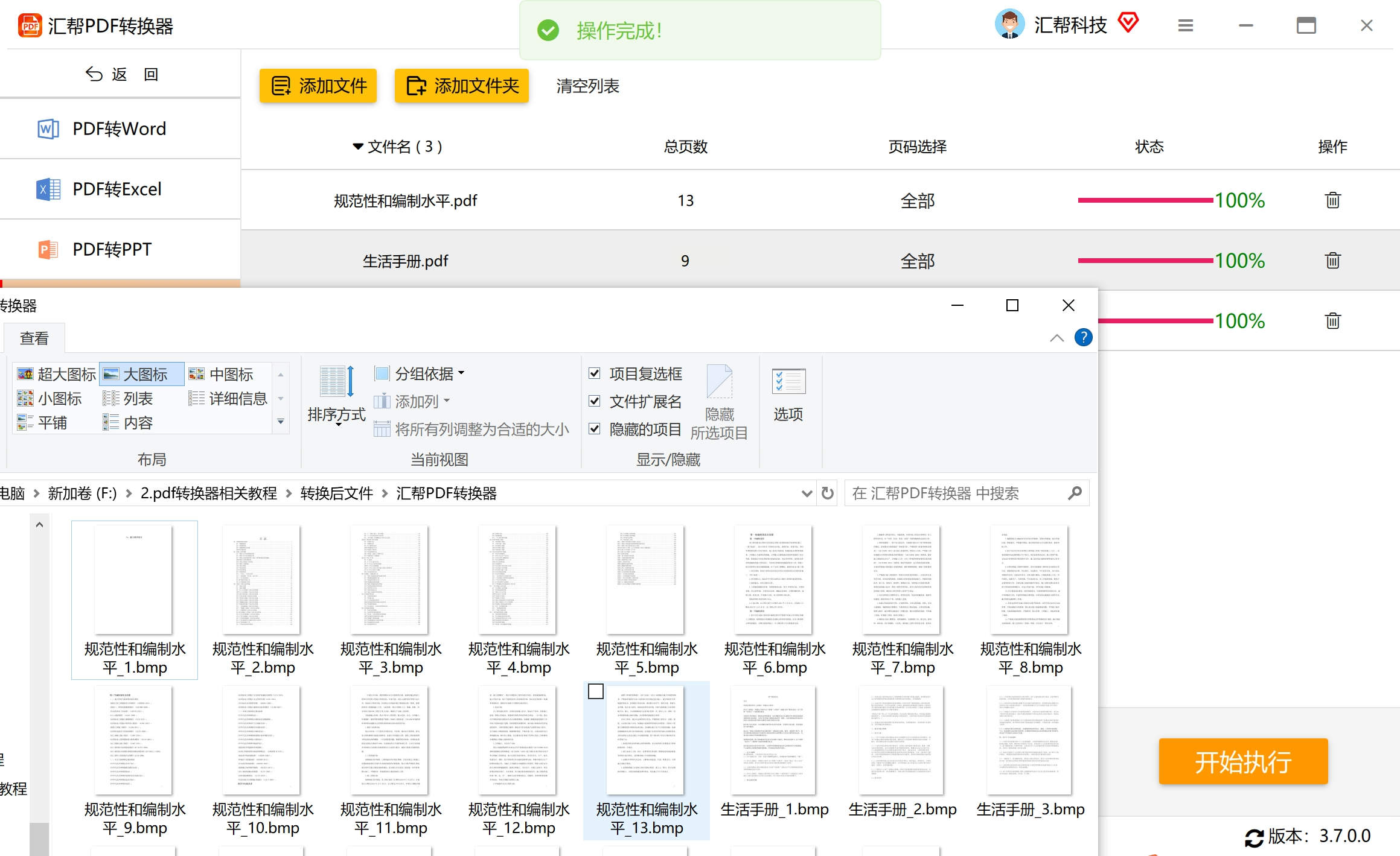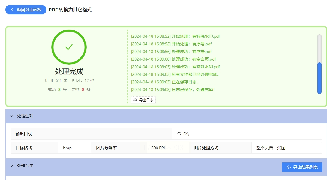 5. 完成验证与输出管理:转换完成后,软件会弹出提示框并显示“处理完成,全部成功”或类似信息。您可以点击“打开输出文件夹”直接查看转换结果。建议按照原始PDF文件名检查生成的BMP文件,确保每个页面都正确转换。