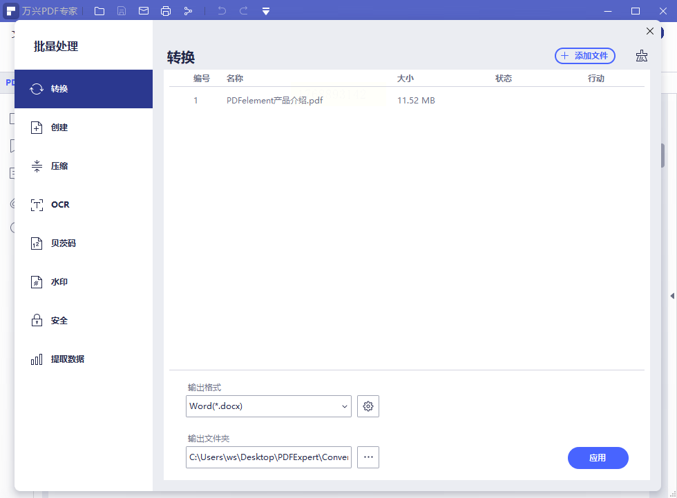 步骤二:点击“转换”后,会展开一个次级菜单,在其中选择“转换为PPT”。随后,软件会弹出一个新的设置面板。在这个面板里,你需要确保“输出格式”已经选定为PPT,然后点击“输出文件夹”旁边的选项,为即将生成的PPT文件选择一个存放位置。最后,点击面板底部的“应用”按钮,转换过程就自动开始了。