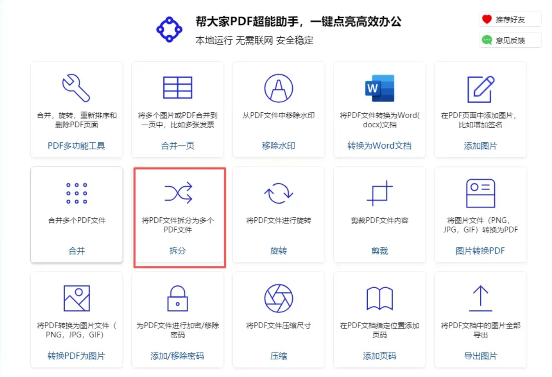 帮大家PDF超能助手主打轻量化设计,界面简洁无广告,特别适合电脑操作不熟练的用户,核心优势是支持"一键拆分"和实时预览。