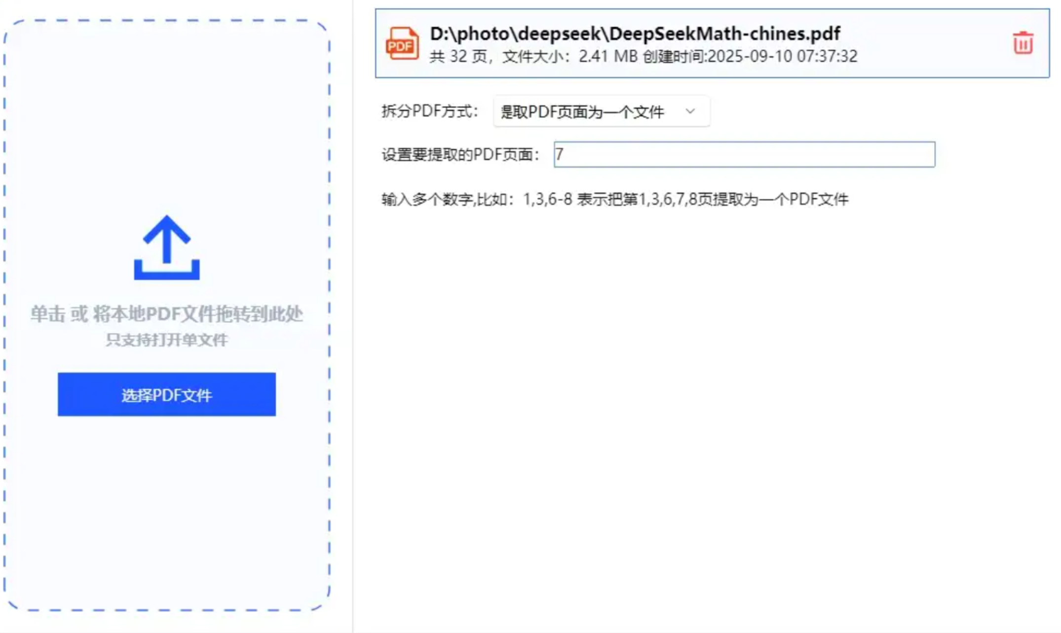 - 提取范围:支持"页码范围"(如1-3,5)和"从...到..."两种模式,适合不同提取场景