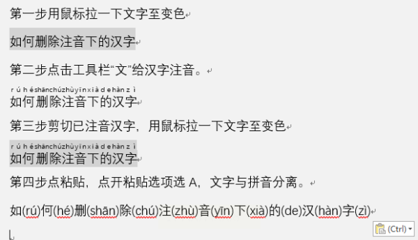 选中已添加拼音的文本,按Ctrl+X剪切,然后右键点击目标位置,选择【粘贴选项】中的"只保留文本"(或直接按Ctrl+V粘贴,然后在弹出的粘贴选项中选择"合并格式")。此时,原汉字会被删除,只保留拼音。