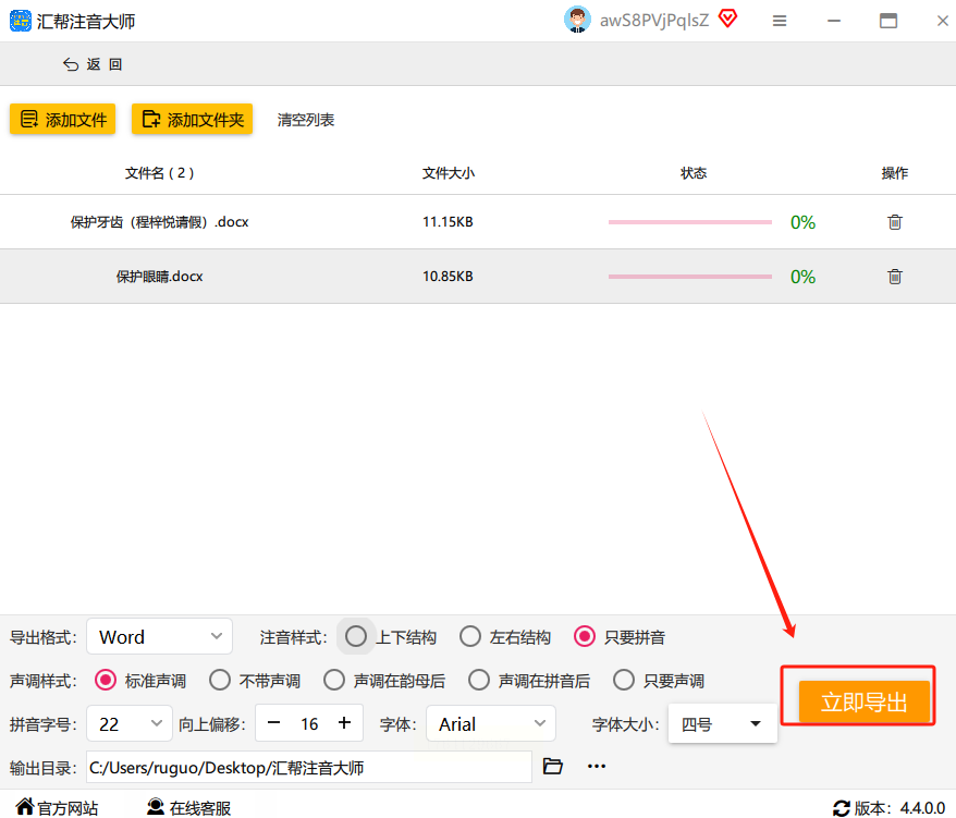 然后,在文件添加好后,注意下方的设置选项。导出格式选Word,注音样式选“只要拼音”,声调样式用标准声调。这样,软件就会自动去掉汉字,只保留拼音和声调。