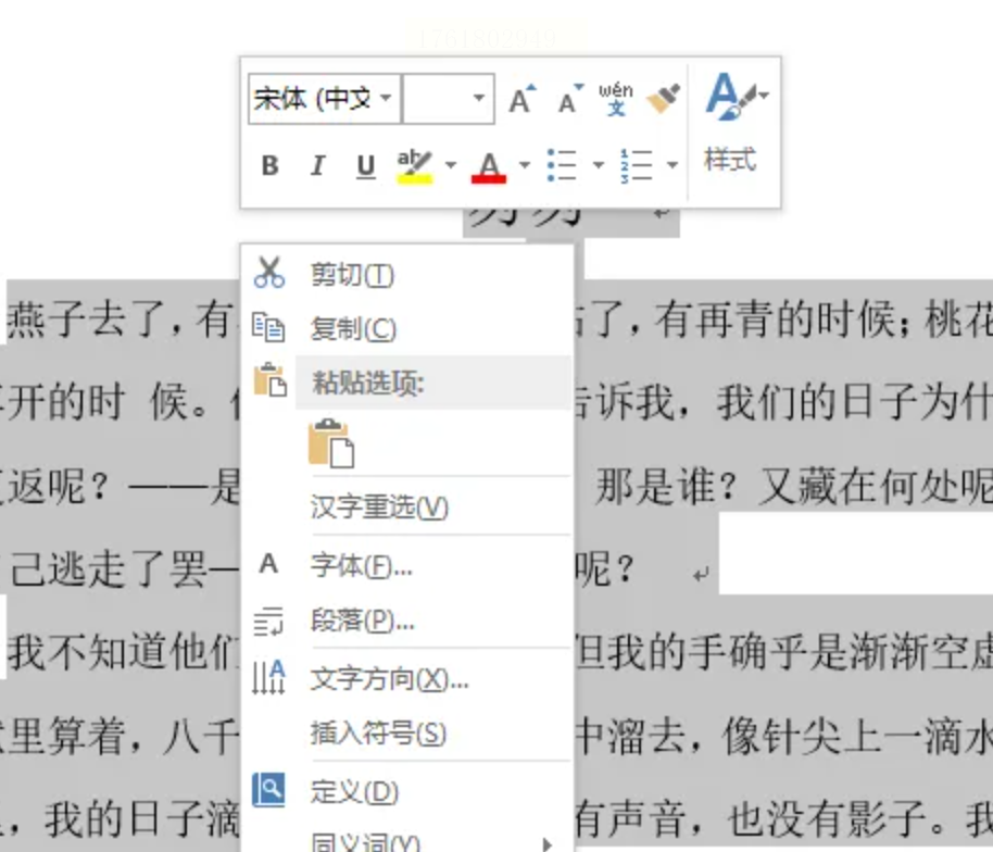 2. 打开Word文档,选中需要添加拼音的文字。如果要给全文加拼音,直接按Ctrl+A全选。