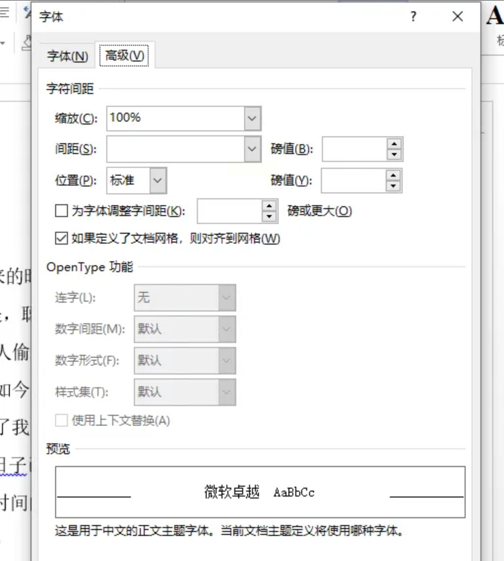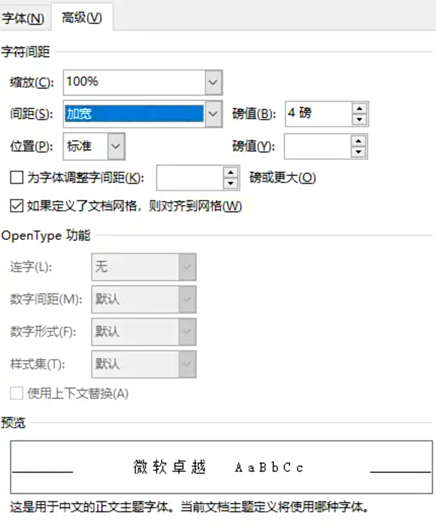 - 切换至【高级】选项卡,将【字符间距】→【间距】设为“加宽”,值“4磅”;