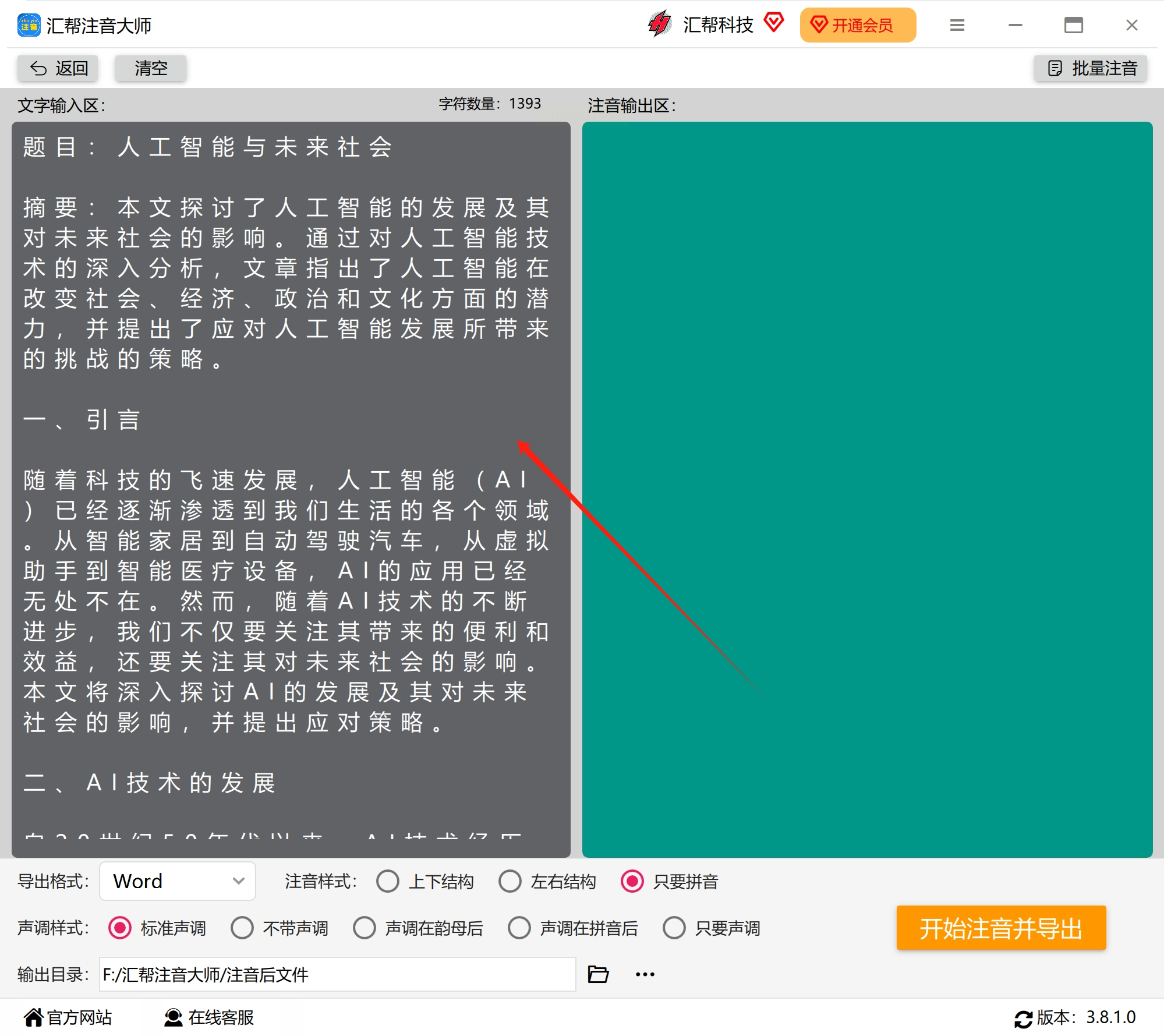 在选定的工作模式下,将需要转换的汉字内容导入软件。常见的方式包括:直接在输入框中粘贴文本、通过“打开文件”按钮导入文档(支持多种格式如TXT、Word等)、或将多个文件拖放到指定区域进行批量处理。注意查看软件支持的文件格式和大小限制。