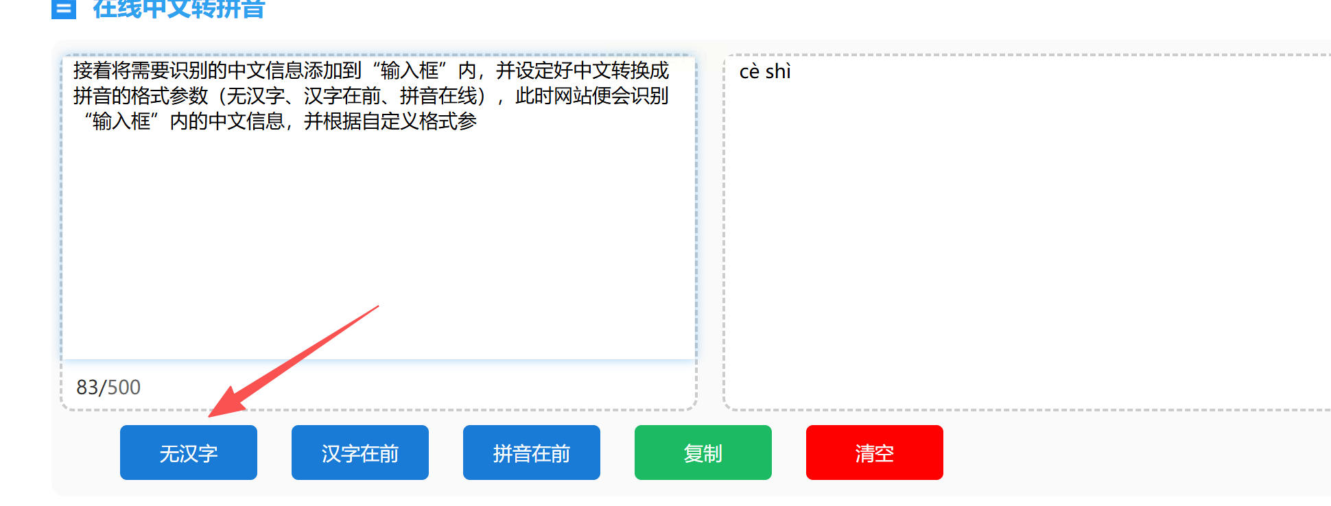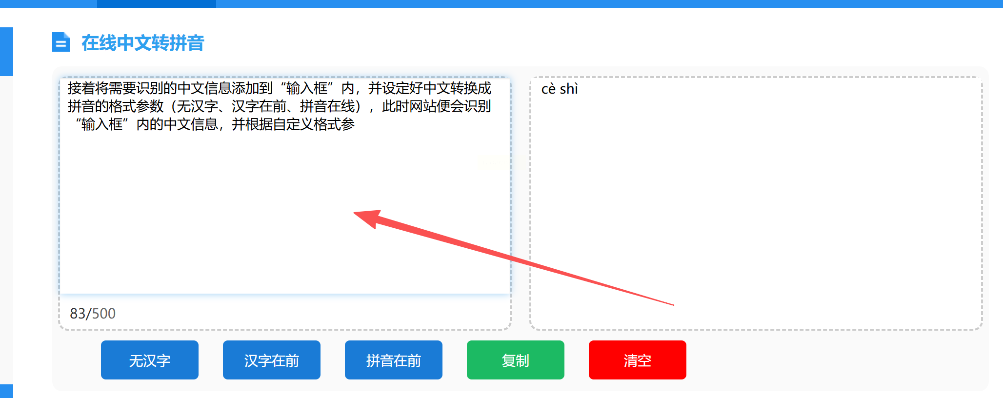 在转换界面中,您通常会看到左右或上下排列的文本框。将需要转换为拼音的汉字内容粘贴或输入到左侧或上方的输入区域。大多数在线工具对输入文本的长度有一定限制,但通常足以满足段落级别的转换需求。如果您的文本量特别大,可以考虑分批处理。