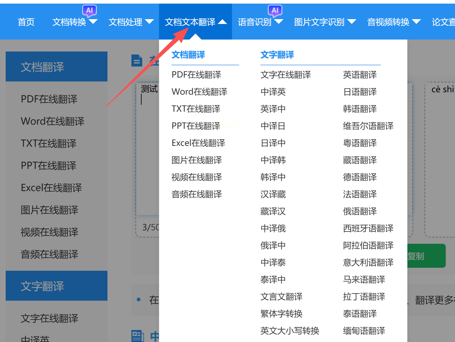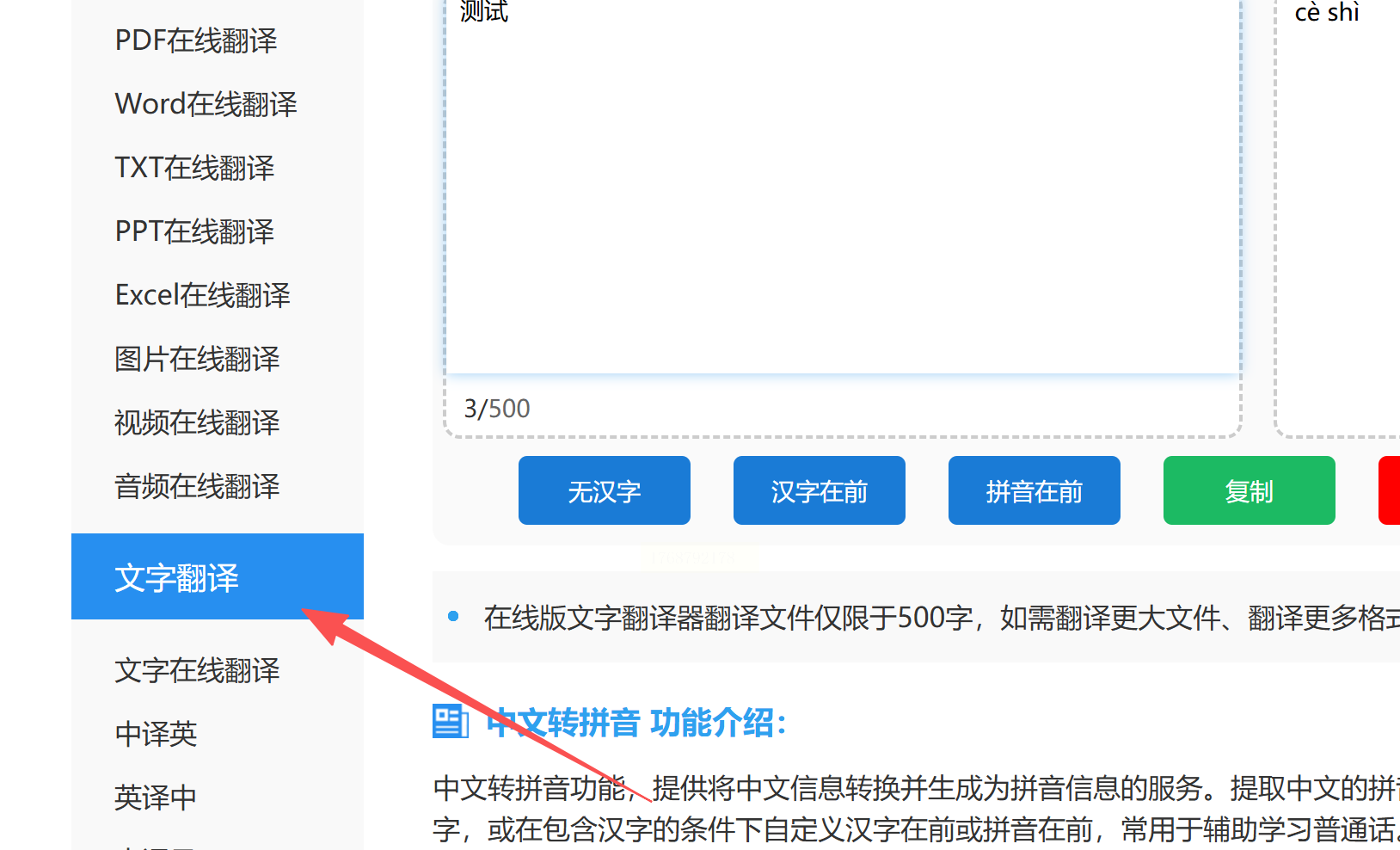 在网站主页或功能列表中,寻找“文档翻译”、“文字转换”或类似命名的选项。点击进入后,您可能会看到多种语言和转换类型的选择界面。此时请注意区分“翻译”和“拼音转换”功能——我们需要的是将汉字转换为拼音,而非翻译成其他语言。