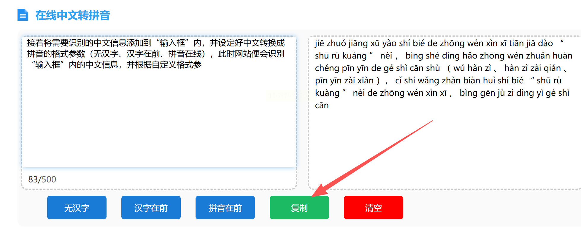 如果对转换结果满意,您可以使用工具提供的“复制”按钮将拼音文本复制到剪贴板,然后粘贴到任何文本编辑器或文档中保存。部分工具还可能提供直接下载文本文件的功能,您可以根据需要选择最方便的保存方式。