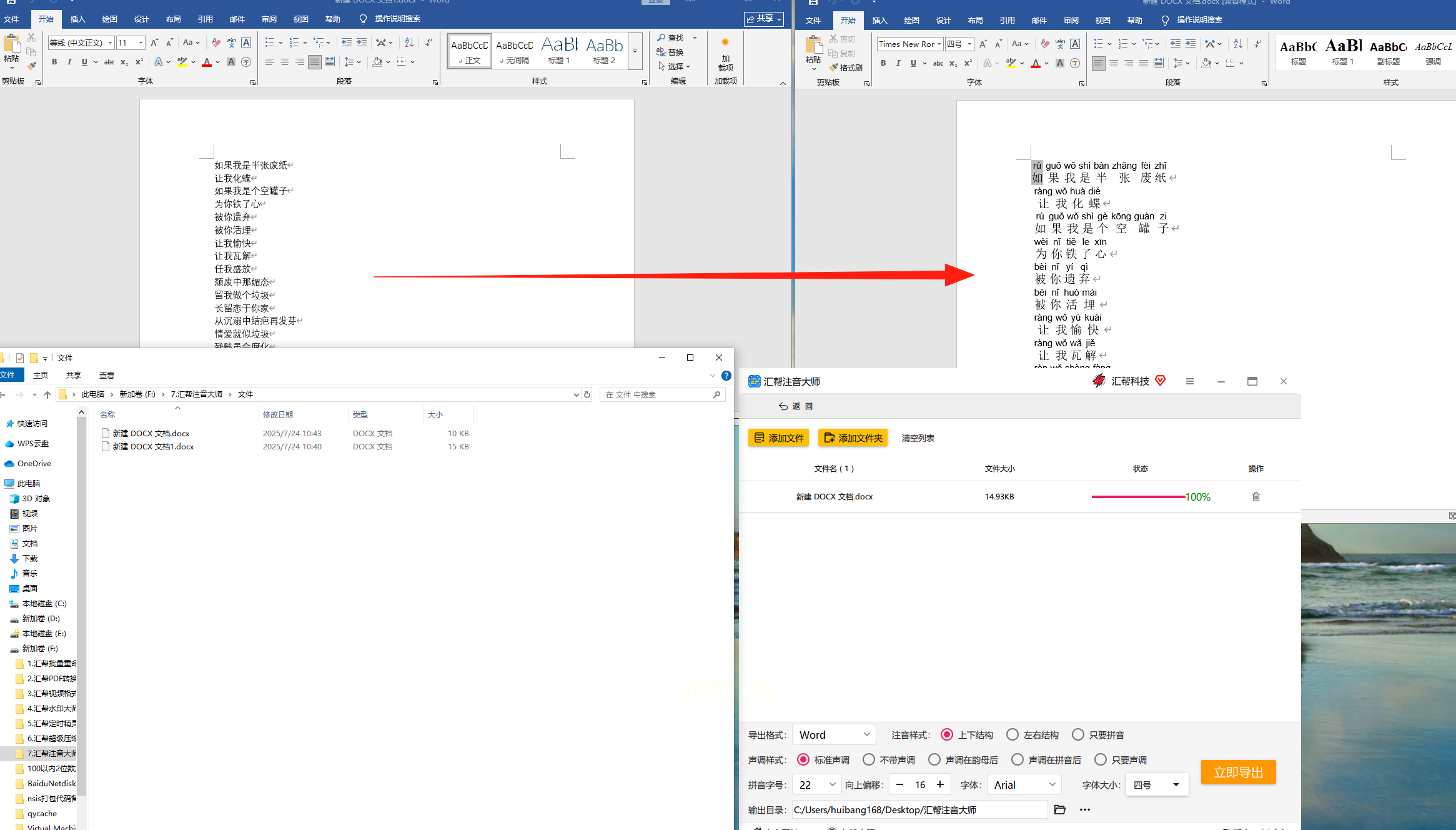 4. 选好输出目录,点“立即导出”,导出后打开Word就能看到拼音自动排版好了,和原文完全对应。