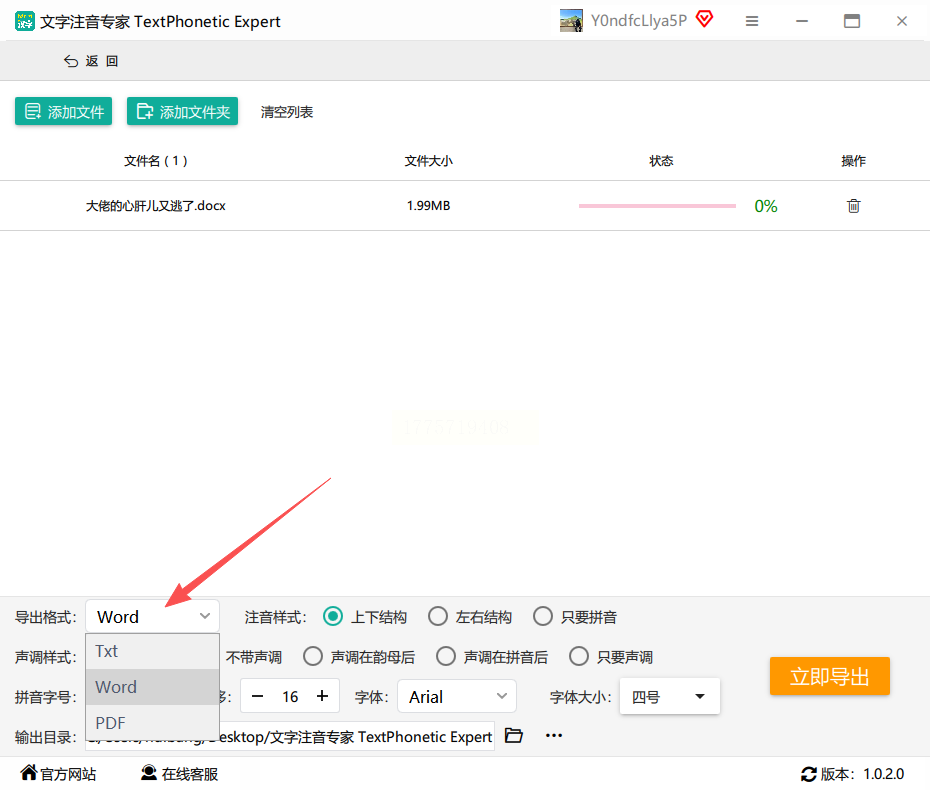 4. 点击【立即导出】,软件会自动处理并生成带拼音的文件