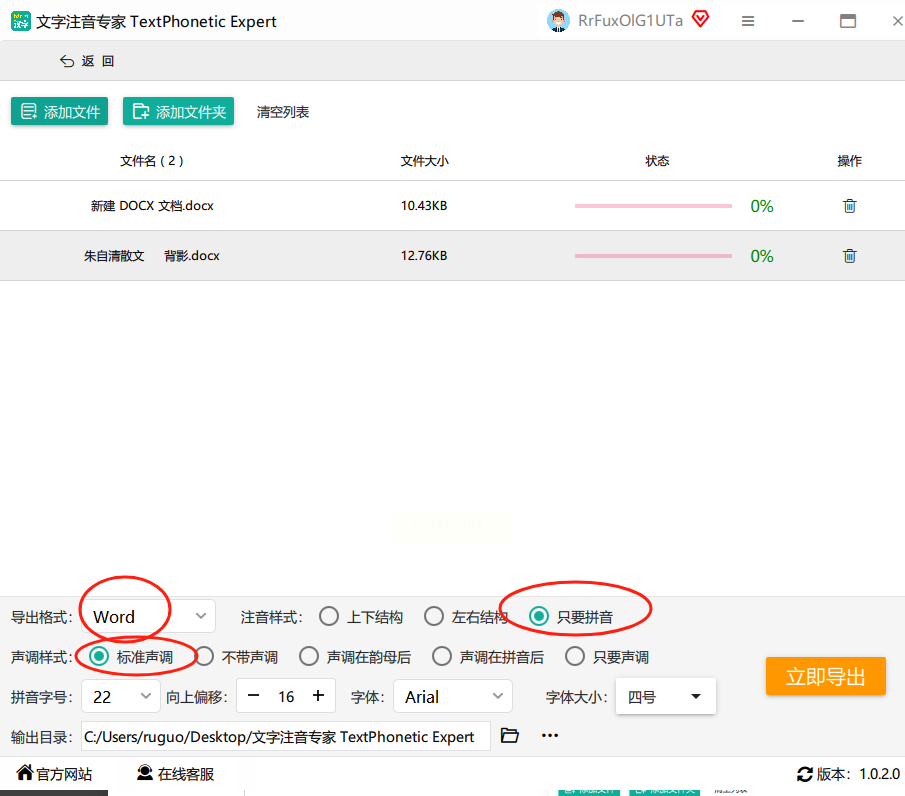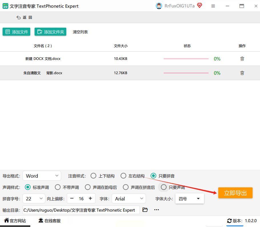 在窗口底部的“参数设置”区域,确保【导出格式】为“Word文件”(方便兼容);【注音样式】选择“只保留拼音”(核心设置,避免汉字残留);【声调样式】选“标准声调”(符合语文规范)。如果需要调整字体大小、间距等,也可以在这里微调。