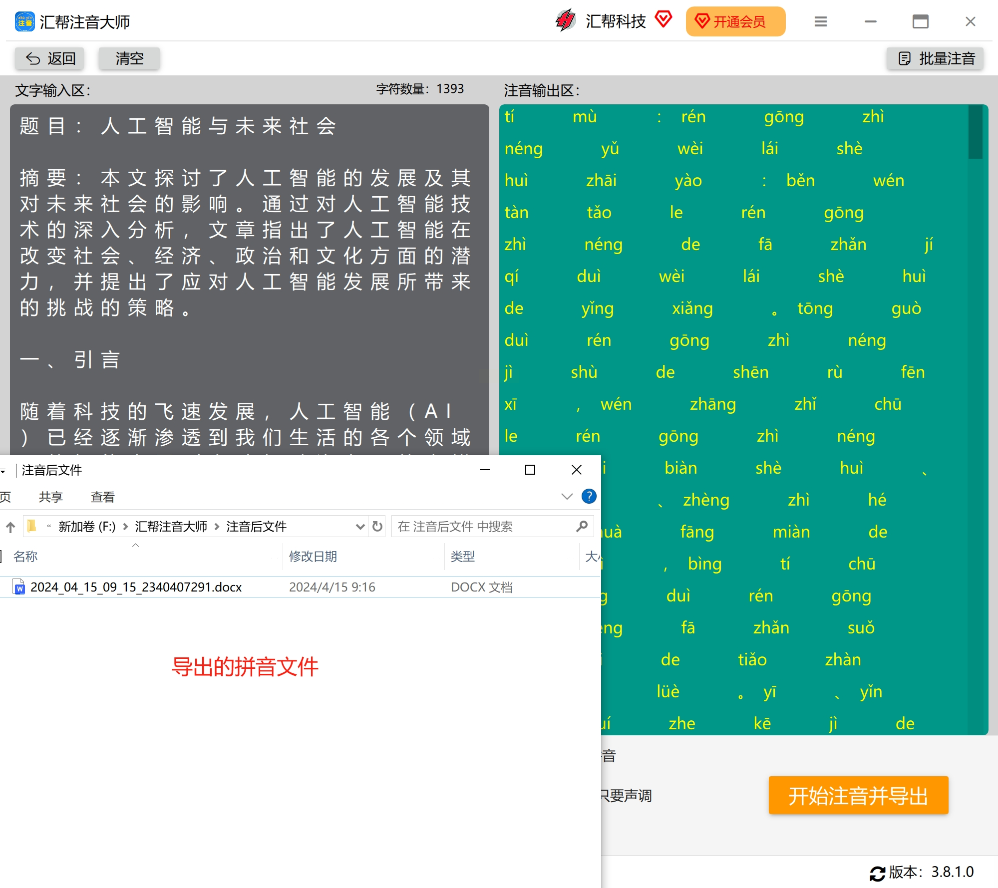 所有设置都检查好后,找到那个最明显的按钮——“开始注音并导出”。点击它,软件就开始工作了。转换速度取决于文字多少,一般几十万字也就一两分钟。