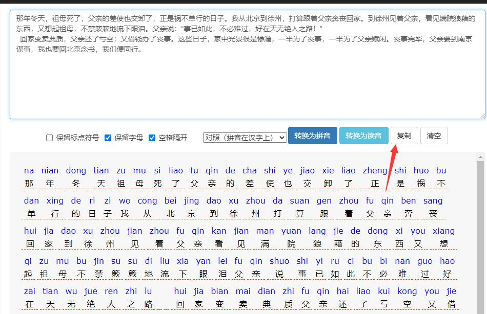设置好后,点击“转换为拼音”按钮,下面就会立即显示加好拼音的内容。这时候要快速检查一下转换效果,特别是多音字有没有标对。