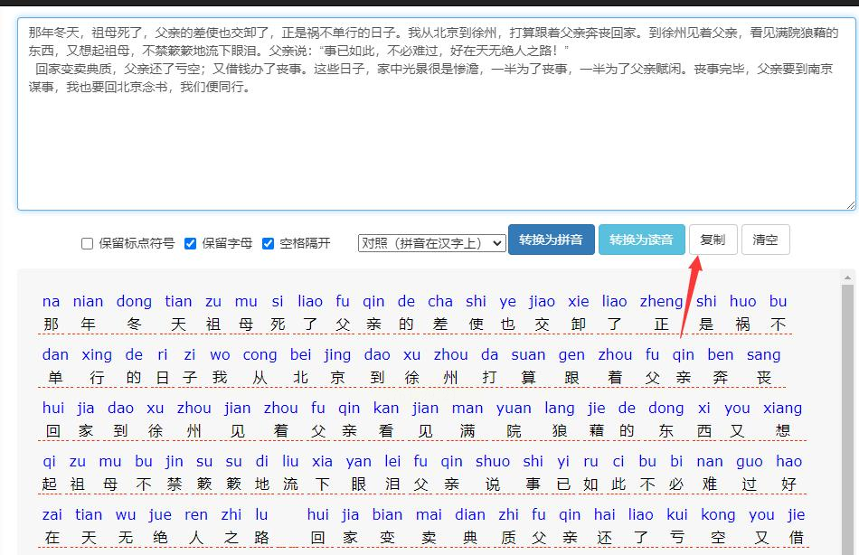 5. 一键转换:点击“开始转换”,稍等5-10秒(视字数多少而定),在预览区检查拼音是否正确,确认后点击“复制全部”粘贴到Word。