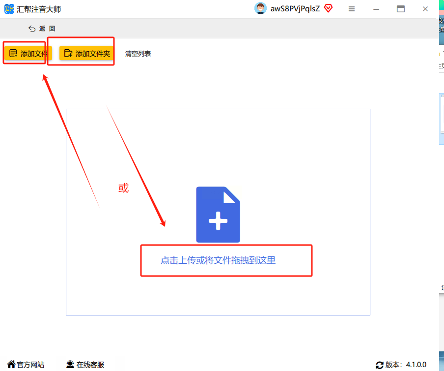 3. 添加文档:点击左上角“添加文件”按钮,从弹出的文件夹中勾选需要注音的Word文档(支持. docx、.doc格式),也可以直接把文件拖拽到中间空白区域。