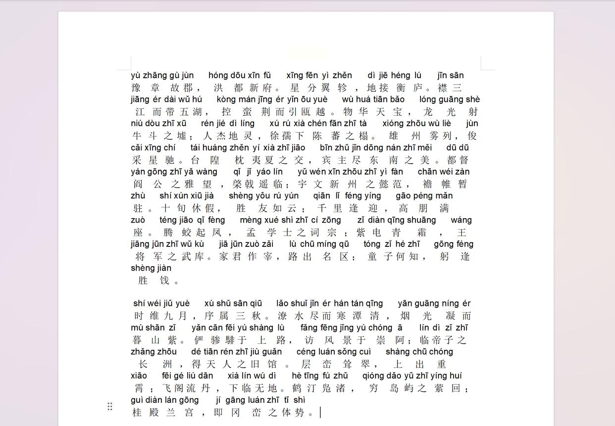 效果展示:原本的文字会变成“花朵(huā duǒ)”“天空(tiān kōng)”这样,每个汉字上方都有标准拼音,清晰明了。