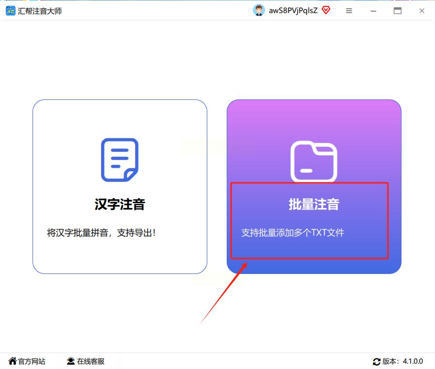 1. 打开软件:双击桌面上的汇帮注音大师图标,进入主界面,点击醒目的“批量注音”按钮。