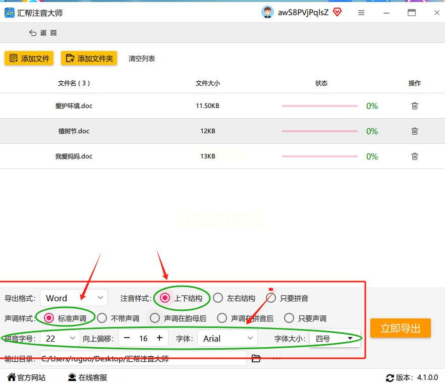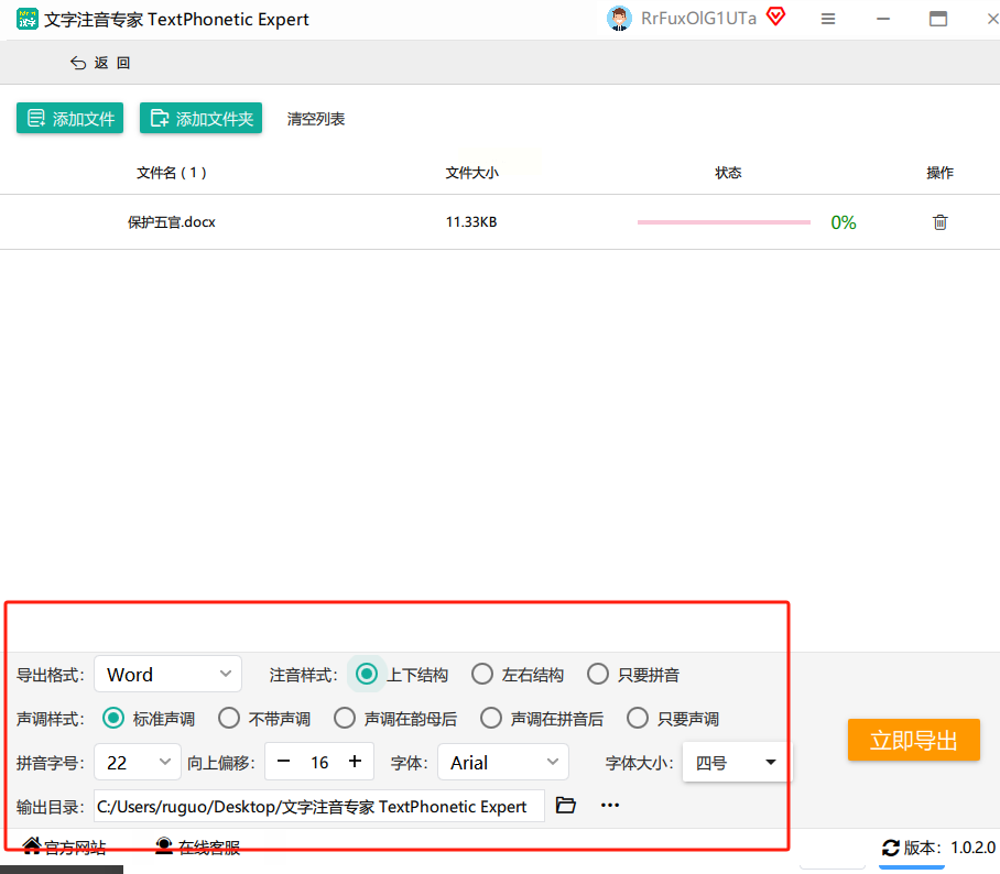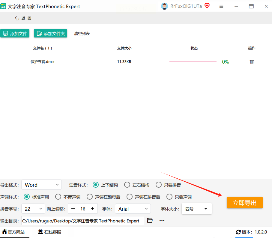 5. 导出保存:确认无误后点击“立即导出”,选择保存路径,进度条走完后即可查看带拼音的文档。