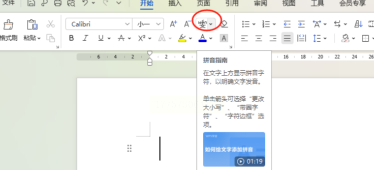 2. 找到拼音工具:点击“开始”选项卡,找到“拼音指南”按钮,点击后弹出“拼音指南”窗口。