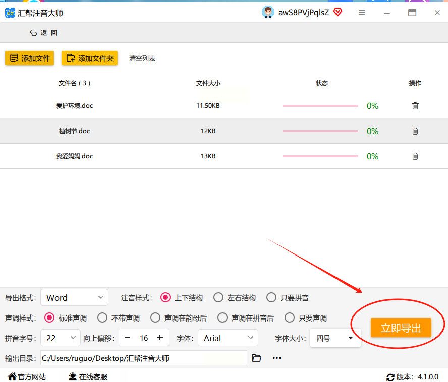 4. 开始转换:点击“立即导出”,等待转换完成,生成带拼音的新文档。