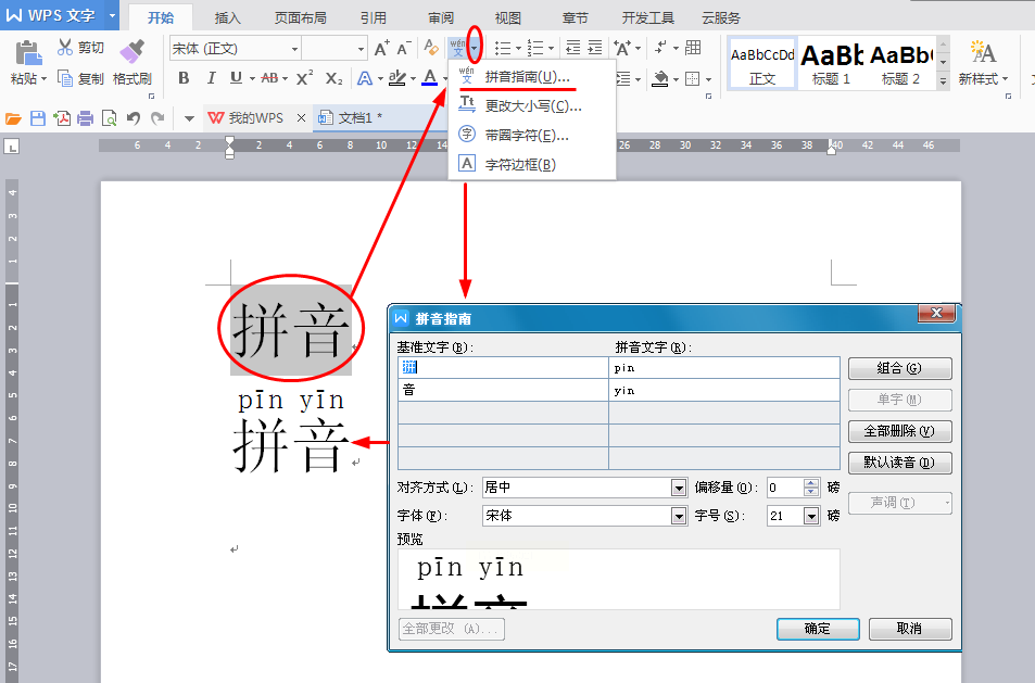 4. 调整拼音的字体、字号和位置,预览好了点【确定】,拼音就生成了,能直接保存成Word或WPS格式;