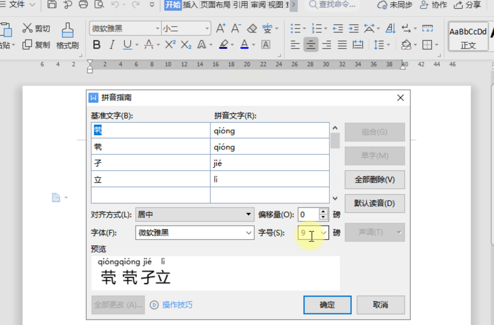 5. 确认无误后点【确定】,拼音就会整齐地显示在汉字上方,而且和汉字绑定得很牢,不会乱跑到别的地方去。
