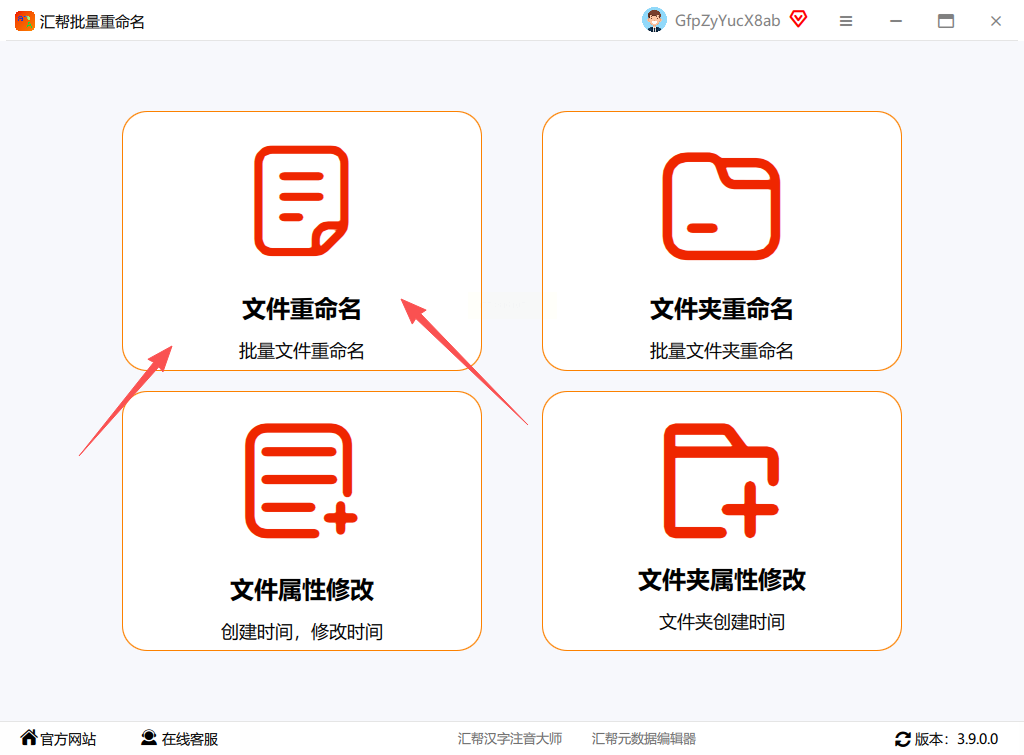 1. 打开汇帮批量重命名软件,在主界面选“文件重命名”功能。