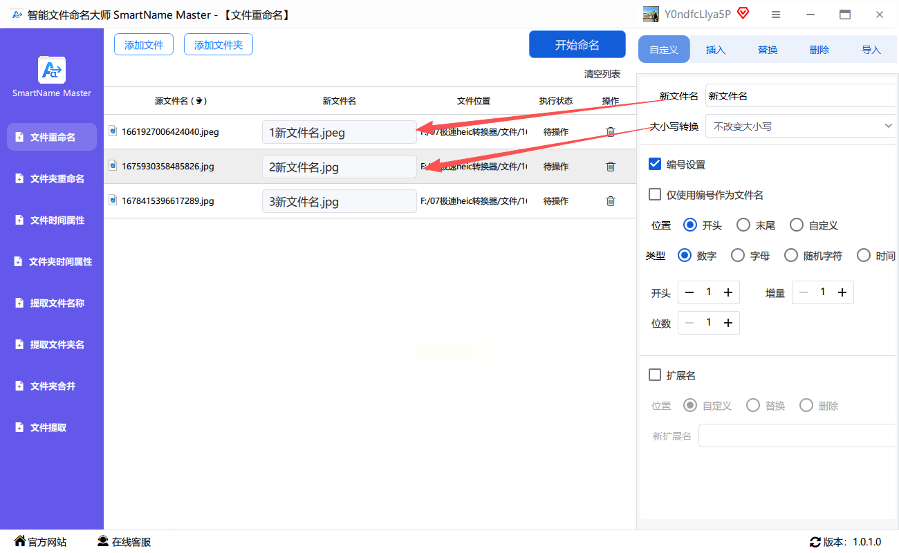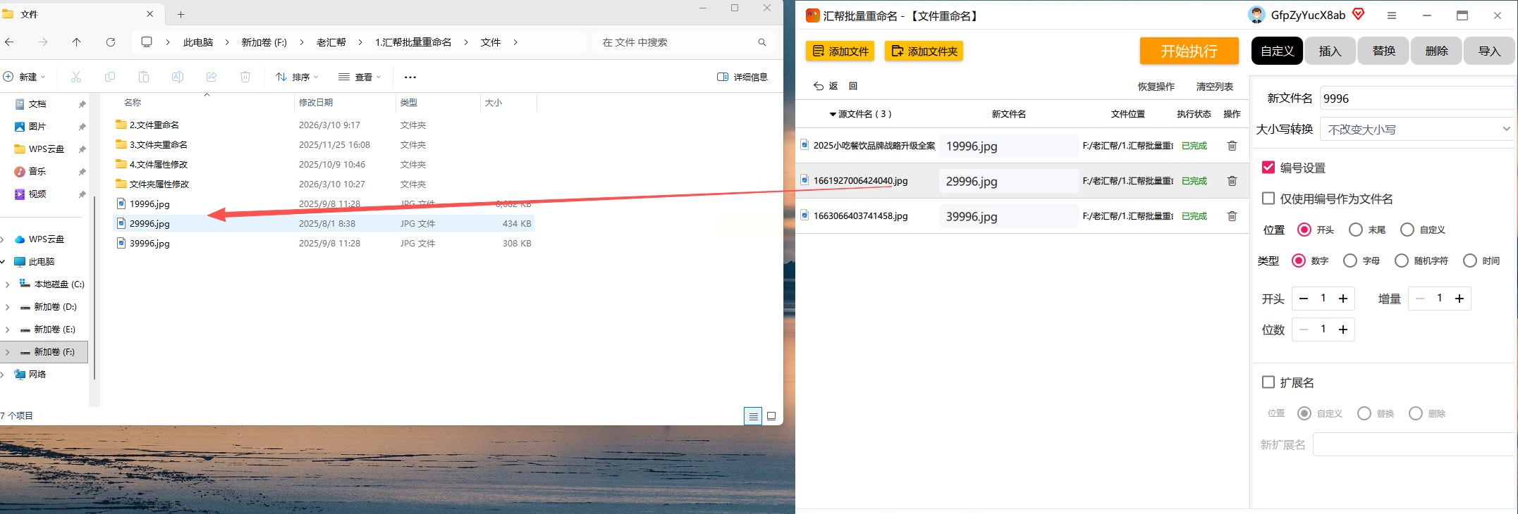 核心优势:支持更多自定义选项,除了编号和扩展名,还能设置前后缀文字,操作逻辑和汇帮类似但扩展性更强,能更好满足图片重命名序号和名字的个性化需求。