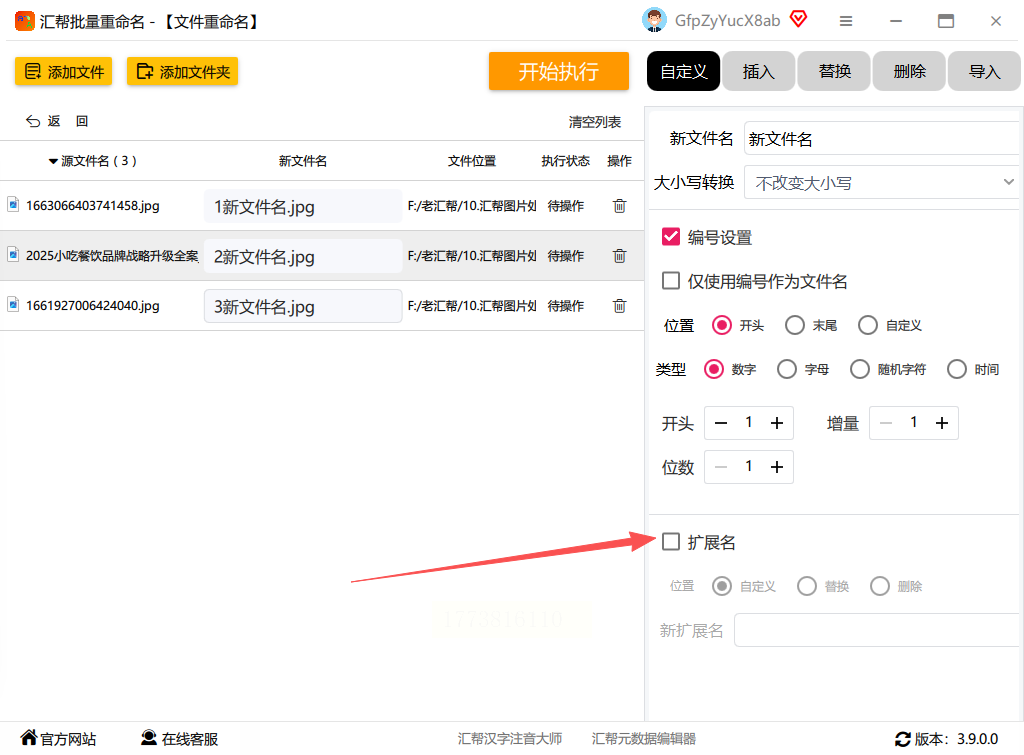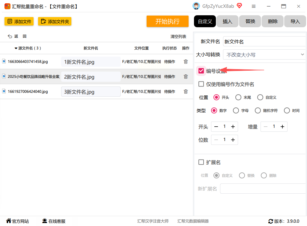 4. 编号设置和扩展名设置和汇帮一样,勾选对应的选项就行。